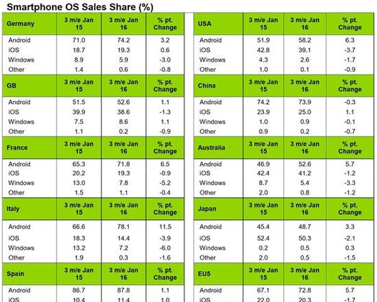 Kantar公布了截止2016年1月16日三个月内的全球多个主要市场的手机操作系统市场分布情况,对比去年同期,Android是一路狂飙,Windows则是全面败退。