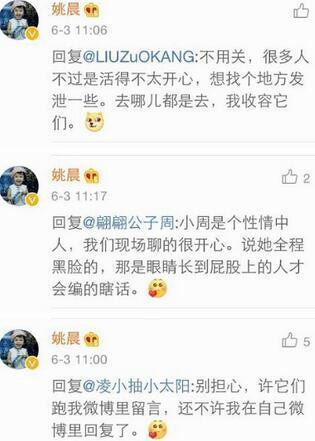 6月3日,姚晨又在微博回复了一些网友的留言,其中一条对周迅作了评价:“小周是个性情中人,我们现场聊得很开心。说她全程黑脸的,那是眼睛长到屁股上的人才会编的瞎话。”
