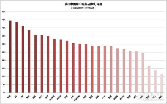 进一步考虑上述品牌仍存在的样本数量不多,数据偶然性大的情况,我们再次缩小范围,仅看接近总数据量1%,即参与调查样本超过4500个的品牌。按此标 准,只剩下了14个品牌,按照好评度从高至低排名分别是苹果、中兴、OPPO、乐视、小米、华为、联想、魅族、vivo、三星、努比亚、荣耀、金立、酷派。