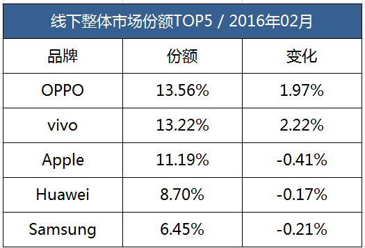 在手机市场摩肩接踵的大环境下,严重疲软的势态使很多小众厂商难以立足,反观上层,根据二月份的赛诺数据显示,线下整体市场份额的前五大品牌为OPPO ,vivo,Apple,Huawei,Samsung,大部分均有下滑趋势,而OPPO却以13.56%的傲人成绩独居榜首,在国内线下整体市场占据最大份额,这与OPPO一直以来将年轻用户的核心需求放在第一位的理念有很大的关系。