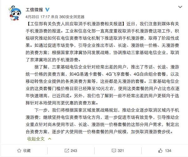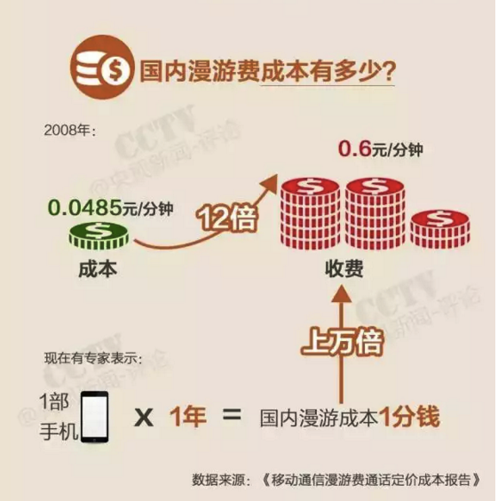 国内漫游费成本(图片来源于微信@央视新闻评论)工信部回应没提时间