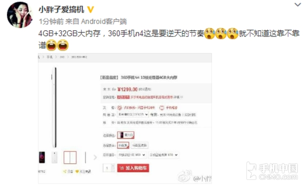 那么这款高颜值高性能的360手机N4售价会是多少呢?微博用户居然给出了该机的京东预售界面,价格写着1299元,结合4GB运存和快充来看,这个价格极具吸引力。