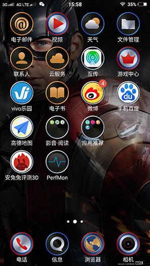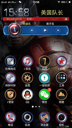 另外,其系统图标也进行了重绘,摒弃了原有的矩形图标设计,而是统统改用圆形图标,恰好与队长的圆形盾牌相一致。至于美丑与否,仁者见仁智者见智,并非 美队迷的笔者不做过多评价。当然,对于普通用户来说,也可以通过手机的“i主题”更改主题样式。它拥有多套在线主题供用户选择,可以满足不同用户的个性化 需求。