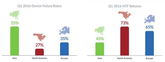 故障的区域特征亚洲、北美、欧洲等不同消费市场移动设备可靠性并不相同,其中亚洲和欧洲市场手机出现故障的概率更高,北美市场手机完好(NO TROUBLE FOUND)的比例最高,报告不排除硬件维修人员专业素质的差异。