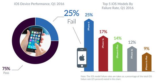iOS设备未通过检测的比例相比Android大大降低,仅仅为25%。其中iPhone 6、iPhone 5s故障率最高,新设备和Plus版iPhone故障率相对更低。
