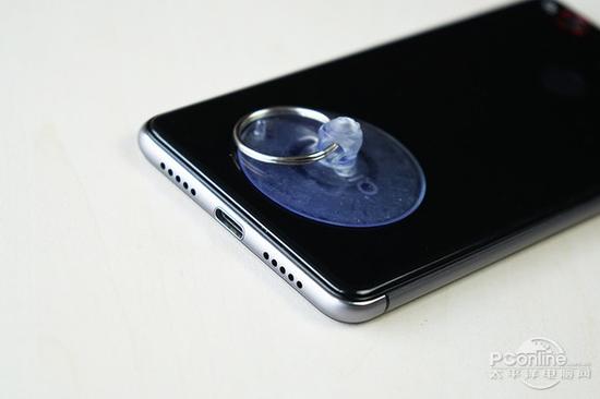 笔者环顾Z11 mini的四周,没有发现机身有螺丝位。而这也说明了Z11 mini无需分离屏幕与中框,在打量了一下机身后壳与中框之间的贴合程度之后,决定稍微加热后壳表面,然后利用吸盘从机身底部开始分离中框与后壳。