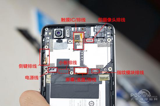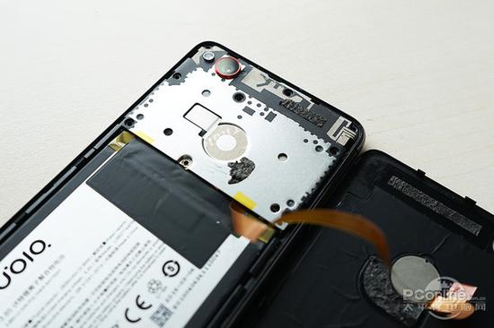 后壳的指纹识别模块采用软排线与主板进行连接,而排线的插座则隐藏在主板的保护盖里头。保护盖的设计大多使用在可拆卸后壳的机型,而Z11 mini也使用了这种设计明显是点乾坤的。