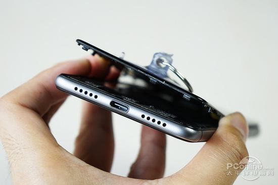 稍有缝隙就可以利用塑料撬棒进行分离,我们可以发现后壳与中框采用塑料卡扣进行连接,扣紧力度适中,为日后的维修工作带来便利。而靠近机身的上/下两端明显有粘合剂粘合固定,而在拆解之前先加热则有利于粘合剂的软化。