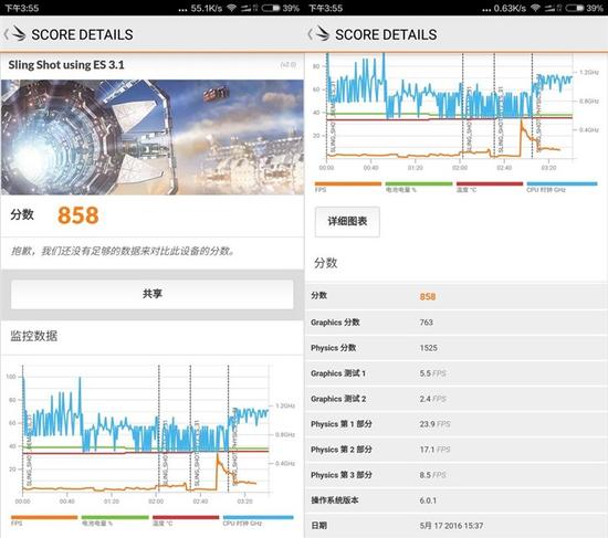 随后使用了3DMark 中“Sling Shot using ES3.1”场景进行跑分测试,它的三角形生成数量庞大,比较考验GPU的能力。测试过后,小米Max得分858分,处于中高端水准。