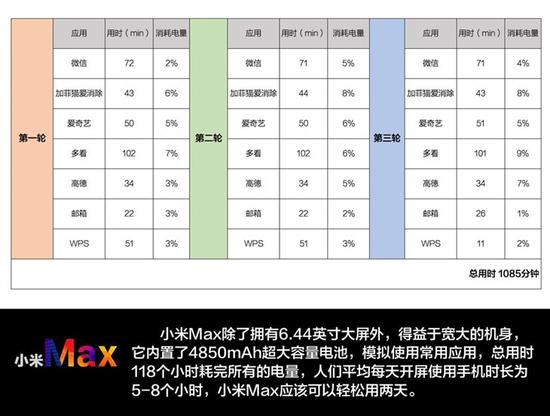 我们模拟了使用小米Max运行常用应用,包括使用不同时长的微信、加菲猫爱消除、爱奇艺、多看阅读、高德地图、邮箱、WPS办公,进行了三轮测试直至将全部电量耗完,记录每个应用的用时和所消耗的电量。
