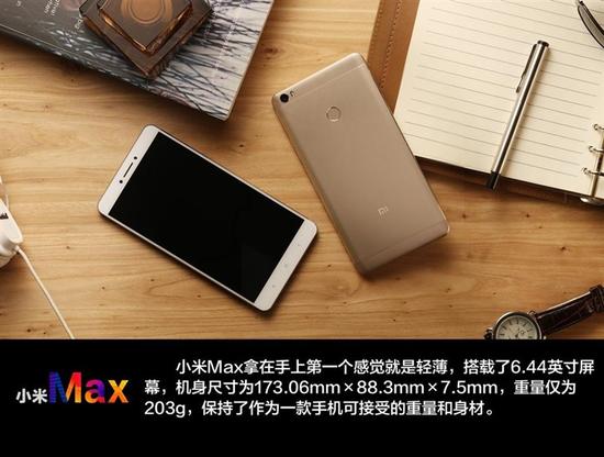 小米Max的6.44英寸大屏比iPhone 6s Plus的5.5英寸屏幕大37%,而203克重量仅仅比iPhone 6s Plus重了10克,与两枚一元硬币相当。而整机面积仅大了6%。