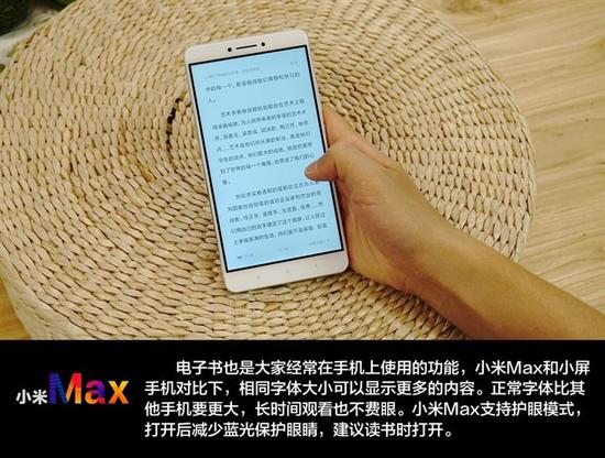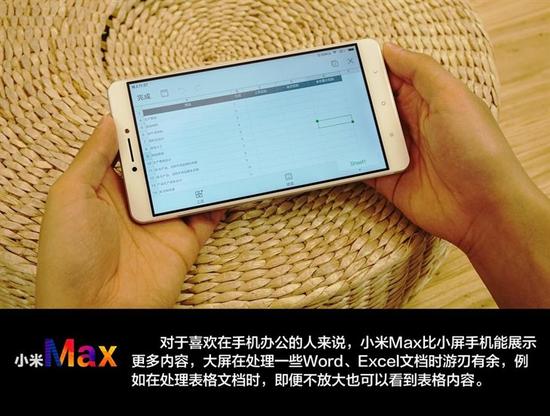 对于喜欢在手机办公的人来说,小米Max比小屏手机能展示更多内容,例如使用同样的MIUI自带邮件,小米Max可以比小米5多展示两条邮件内容,而大 屏在处理一些Word、Excel文档时更是游刃有余。小屏手机最大的痛点就是输入文字的时候容易误触,6.44英寸的小米Max可以很好的解决这个问 题,单个按键的面积更大,手机上输入文字也更加爽快。