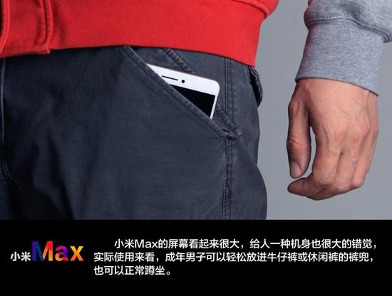 小米Max的屏幕看起来很大,给人一种机身也很大的错觉,实际使用来看,成年男子可以轻松放进牛仔裤或休闲裤的裤兜,也可以正常蹲坐。