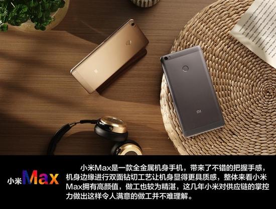 小米Max是小米公司发布了旗下第一款大屏旗舰,属于全新品类,拥有6.44英寸大屏幕,4850mAh大容量电池超长续航等特性,搭载了高通骁龙652处理器,标配指纹识别,全金属轻薄机身。