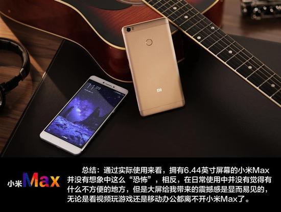 通过实际评测来看,拥有6.44英寸屏幕的小米Max并没有想象中这么“恐怖”,相反,在日常使用中并没有觉得有什么不方便的地方,但是大屏给我带来的震撼感是显而易见的,无论是看视频玩游戏还是移动办公都离不开小米Max了。