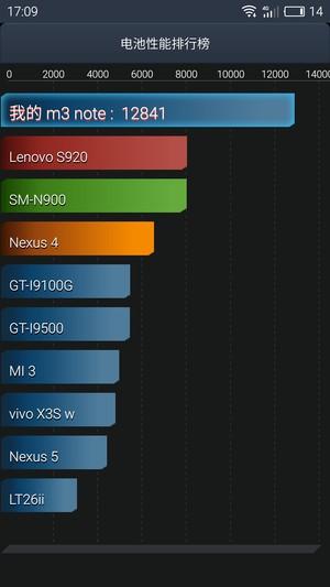 笔者使用安兔兔硬件检测(v2.5.1)进行测试,在默认性能模式/省电模式下跑得的分数相当不错,比起市面许多机型都要高分。硬件优化了功耗,电池容量增大,再加上系统的进一步优化,魅蓝note3的续航能力还是很让人满意的。
