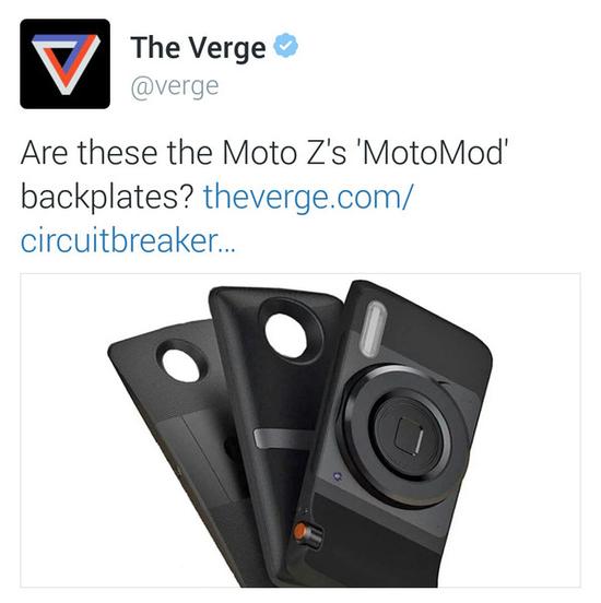 与Moto Z一同登场的似乎还有其他模块化配件,包括立体声扬声器、电池背夹、带LED闪光灯的光学变焦镜头、微型投影机以及广角镜头附件等。Twitter上流传 Moto Z的拍照手柄及外接镜头,如果情况属实的话,Moto Maker或周边配件家族将空前壮大。