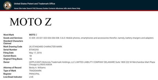 美国专利及商标局(USPTO)公布“MOTO Z”注册商标,下一代Moto将更名为Moto Z。有消息称Moto Z有Z Play和Z Style两款机型:前者配备5.5英寸2K屏幕和骁龙820处理器,厚度仅为5.2mm;后者配备5.5寸1080P屏幕和14nm制程骁龙625处理器。