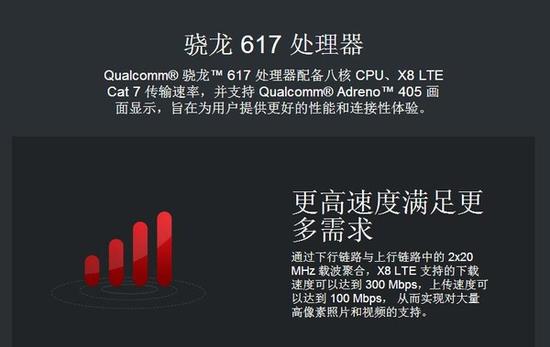 全网通:骁 龙617版本,定位中端的骁龙617基于28nm LP制程工艺打造。CPU架构为8*A53核心,最高主频为1.5GHz。而GPU则为Adreno 405,支持包括DirectX 11.2、OpenGL ES 3.0与OpenCL 1.2 Full Profile等多种特性。集成基带方面一直是骁龙处理器的强项,因此骁龙617也集成了X8 LTE基带,上下行均支持2*20MHz双载波聚合。指出双卡双待全网通,VoLTE通话技术等等。