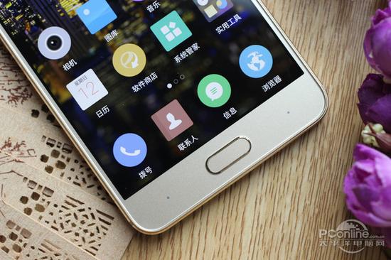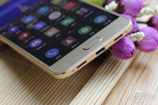 下巴正中是实体home键,集成指纹识别功能,左右各有一枚触控按键。小细节之三:home键略高于屏幕玻璃,手指左右滑动可以触发侧边快捷栏,使用非常方便。触控按键没有背光,多任务和返回的功能可自行定义。