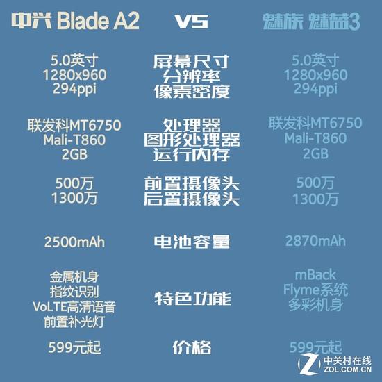 中兴Blade A2/魅族魅蓝3主要参数对比