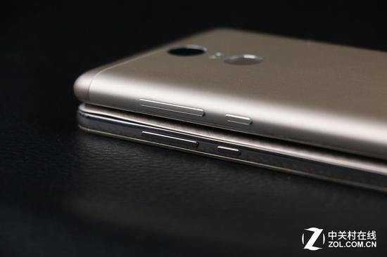 中 框部分,荣耀5A采用了轻奢金属薄镀边框,让整体设计更加具有美感。红米Note3在金属与屏幕的衔接之处采用了金色系的塑料包边。荣耀5A与红米 Note3的按键分别采用与机身相符的材质,分别为塑料的金属,虽然材质不同二者在按键反馈方面做得都不错,不会显得太过于干脆或是软绵。