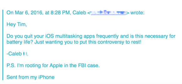 iPhone清理后台不会改善续航最近,有用户询问苹果CEO库克是否应该退出所有应用,以提升电池续航。而他并没有回复这个问题,而是将其转发给了iOS主管Craig Federighi,该主管的回答很简单“ no and no”。苹果高管一直都有回复顾客邮件的习惯,不过这也是 Federighi 首次回复给Tim Cook的邮件,而他的回复也非常言简意赅。